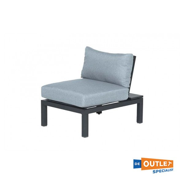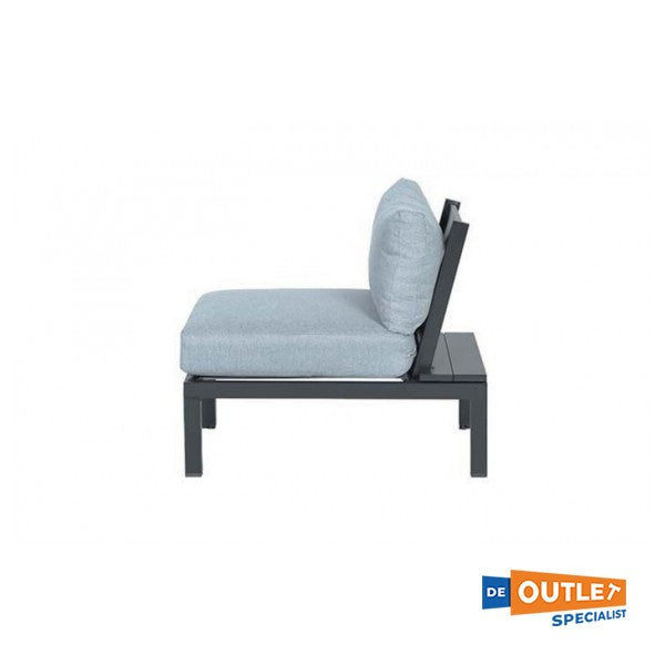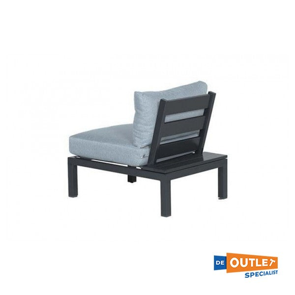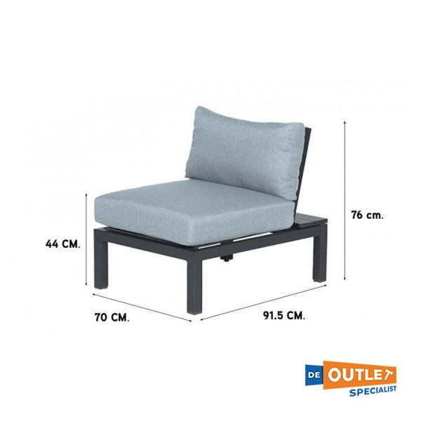 Le cadre est en aluminium. Ce matériau est très robuste, ne peut pas rouiller et est léger. Idéal si vous souhaitez déplacer l'élément. Pour une protection supplémentaire, le cadre est traité avec un revêtement en noir de carbone de couleur qui est résistant aux rayures et à l'impact. Une toile textile est tendue sous le coussin de siège. Ce matériau jaillit, pour ainsi dire, vous avez donc encore plus de confort de sièges.