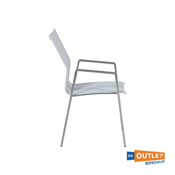 La chaise est en acier inoxydable avec un siège textileen dans la couleur blanc. Textileen laisse toute l'eau à travers, ce qui signifie que la chaise est à nouveau sèche après une douche de pluie. De plus, la chaise est facile à maintenir en raison des matériaux utilisés et résistants aux différentes conditions météorologiques.